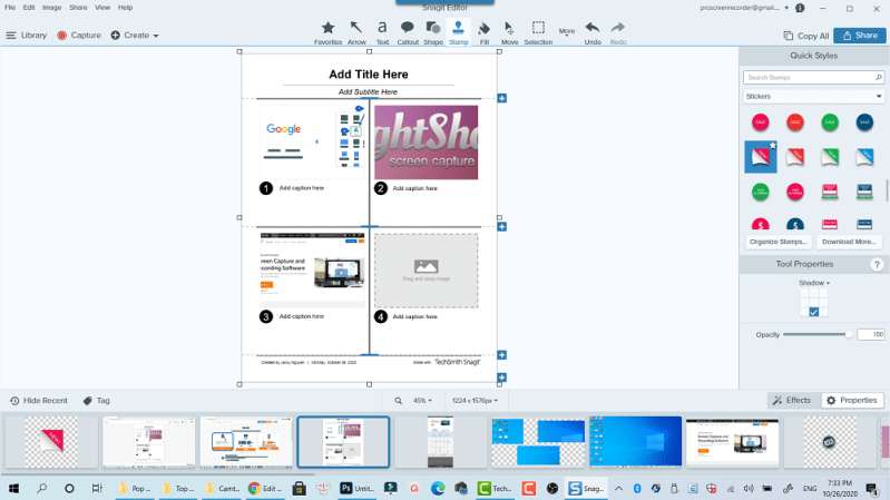 Added to that, Snagit has a fantastic image editor which you easily add annotations to your screenshot, create image from templates, create video from images, or simplify your screenshot with its auto simplify tools. You can also blur sensitive information on your screenshot, add special effect like border, watermark, color removal as well as many other advance features for content creators such as numerous sharing options, and the possibility to upload your screenshots directly to many online hosting servers.