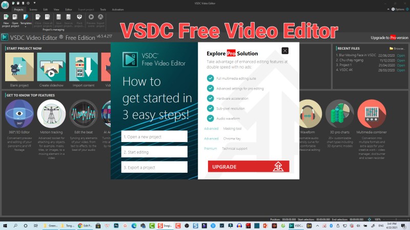 VSDC free video editor supports different video formats and codecs, including 4K video. Most importantly, this software is completely free, no logo inserted when publishing video. Though you sometimes get ads for the VSDC Pro version at launch as well. But if you don’t need features like motion tracking or speed up video output, just skip the ad and continue as usual.