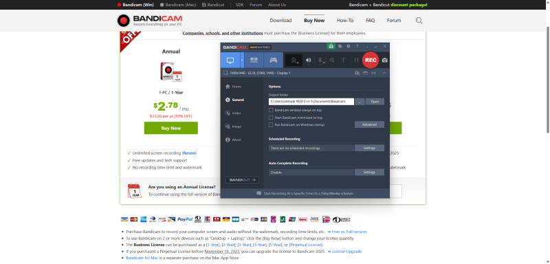 Bandicam offers both subscription and perpetual license for individuals and bussiness. You can choose a yearly license at $33.26 per year, or $59.78 one time purchase at your own decision. Being mentioned that pricing plans can be changed by the company any time. This is the information in 2025.