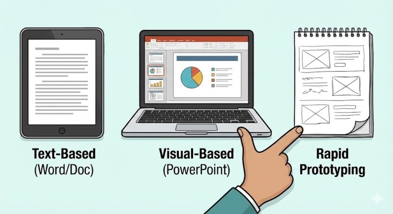 - Visual-Based (PowerPoint): Best for visual learners and clients who need to “see” the layout. It mimics the slide-based nature of many eLearning authoring tools.