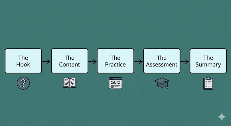 - The Practice: Low-stakes knowledge checks or interactive scenarios.