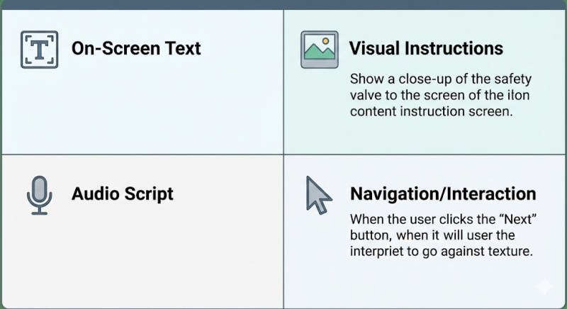 - Visual Instructions: Describe images, icons, or videos. (e.g., “Show a close-up of the safety valve with a red arrow pointing to the release lever.”)